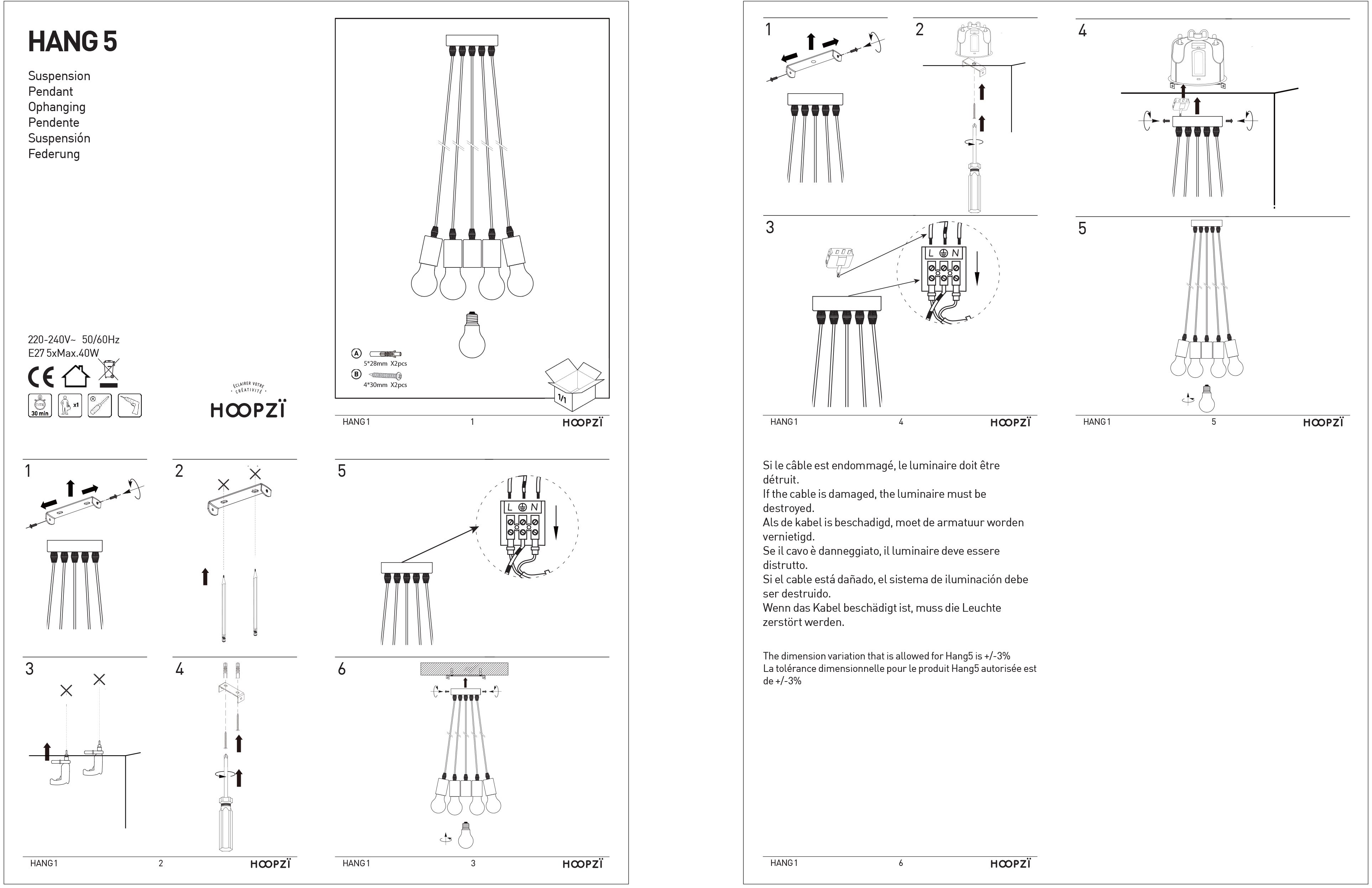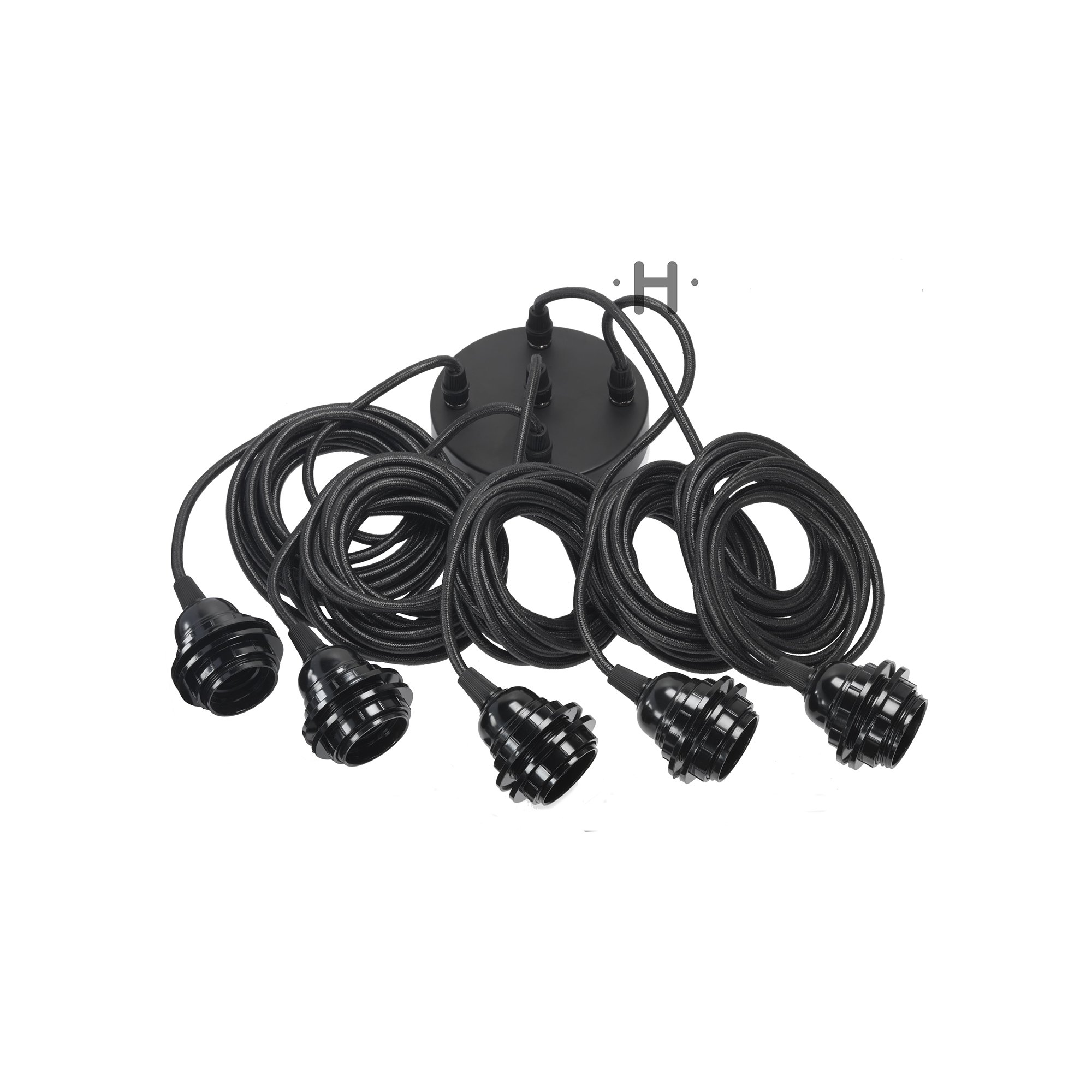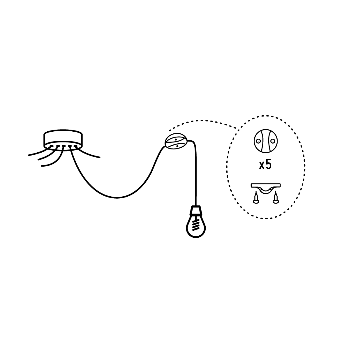 La monture équipée 5 fils électrique noir ton sur ton avec les 5 fils électriques recouverts tissus noir brillant Hoopzi et leurs douille bakélite luxe forment un luminaire monochrome extrêmement décoratif. Vous pouvez positionner facilement les 5 points lumineux là où vous voulez dans vote pièce via les crochets silicone noir Hoopzi inclus avec votre suspension Hang3B.