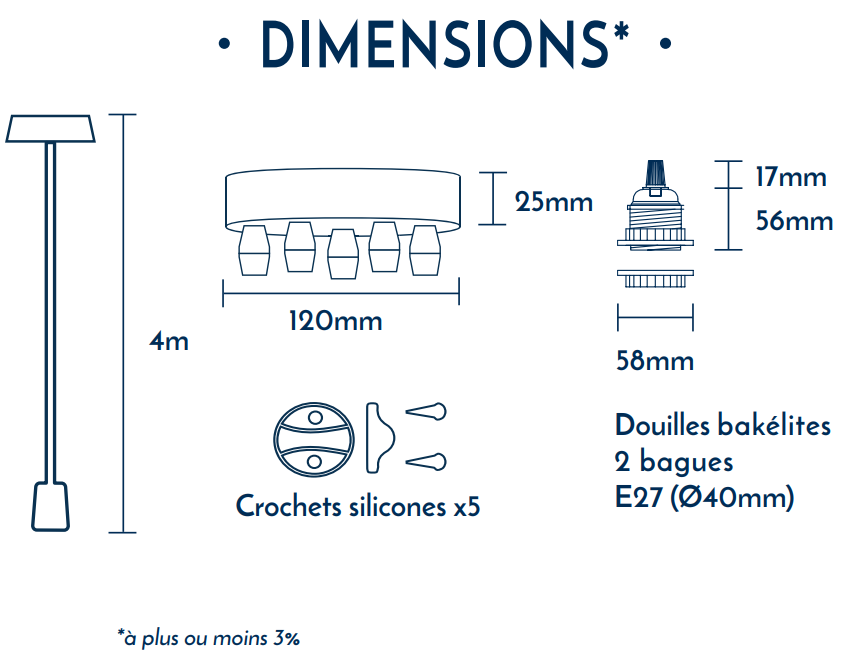 La monture métallique est pré-équipée de 5 fils électriques 2x075mm2 d’une longueur de 4 mètres tressé de fil tissus. Cette longueur vous permet d’ajouter un point lumineux là où vous en avez besoin à l’aide d’un crochet silicon très esthétique ou de laisser-courre à votre créativité.
